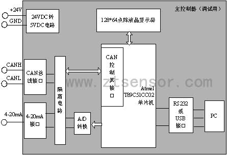 為驗證智能薄膜壓力變送器的功能及性能指標(biāo),必須設(shè)計一主控制器和多個變送器進(jìn)行單向(必要時增加雙向)CAN總線通訊,并將4-20mA模擬量轉(zhuǎn)換為數(shù)字量,將每個變送器節(jié)點的壓力值顯示出來。這個主控制器必須具備CAN總線通信、模數(shù)轉(zhuǎn)換、壓力值顯示、能與PC通信等功能。為方便現(xiàn)場調(diào)試,這個控制器必須體積小、攜帶方便的特點。