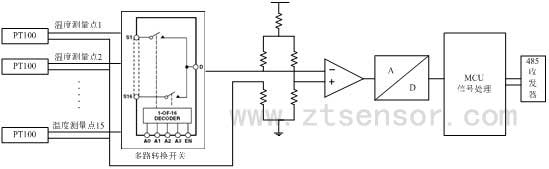 使用體積小、重量輕的鉑電阻(Pt100)作為溫度敏感元件,利用大規(guī)模集成多路轉(zhuǎn)換開關(guān)分時選通每路溫度信號,然后通過高速模數(shù)轉(zhuǎn)換器將模擬溫度信號轉(zhuǎn)換為數(shù)字信號。通過單片微處理器MCU將信號進行數(shù)字濾波,線性校正,偏移補償,最終通過RS485總線將溫度數(shù)據(jù)以指定的幀格式傳送出去。