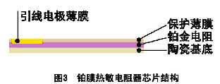 本項目將利用金屬鉑的這種熱電阻制作成薄膜熱電阻。該薄膜熱電阻濺鍍在基底材料上,基底材料可以是金屬材料或者陶瓷。在基底材料上先鍍一層性能優(yōu)良的絕緣膜,再在其上制作電阻膜。圖3是各種功能薄膜的分布圖。第一層是基底材料,上面依次是絕緣膜、電阻膜、保護膜、引線膜。