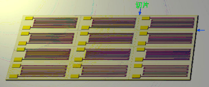 一般選用陶瓷作為基底材料,對于要求快速響應(yīng)的熱電阻采用導(dǎo)熱性好的金屬材料作基底,經(jīng)拋光后,在基底材料上沉積一層絕緣膜,然后在絕緣層上濺射鉑電阻膜,經(jīng)離子束刻蝕成柵條電阻,再在電阻膜層上濺射一層保護絕緣膜。每片基片上可制造10-20支電阻器圖5,芯片制造工藝完成后再進行切片,內(nèi)引線,封裝,檢測。選用PT100作為溫度敏感元件,精度為1/3B級,溫度誤差為0.3度。該電阻在0攝氏度時電阻為100Ω。由于產(chǎn)品工作在-150℃~150℃,且引線長度為0.5m,因此引線選用溫度適用范圍寬的特氟龍F4,它可以制成外徑很細的線纜,質(zhì)量輕。每只溫度PT100鉑膜熱電阻和導(dǎo)線總重控制在1g~1.2g。