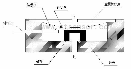 通過(guò)硅平面集成工藝技術(shù)在硅片上制作四個(gè)擴(kuò)散電阻作為應(yīng)力敏感元件,用機(jī)械研磨加各向同性化學(xué)腐蝕方法將硅襯底加工成周邊固支的平膜片彈性力學(xué)結(jié)構(gòu)。四個(gè)力敏電阻,連成惠斯頓全橋應(yīng)變電路,這種電路具有最高的靈敏度、最好的溫度補(bǔ)償性能和最高的輸出線性度。硅杯受到一個(gè)差值壓力,力敏電阻的電阻率改變,引起電阻阻值改變。電阻率的改變是由于硅膜片的形變引起的,測(cè)試端P1與引壓端P2的壓力差與硅膜片的形變成正比,也就是電橋的輸出與壓力差成正比。
