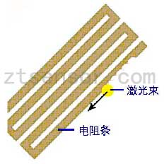 通過(guò)薄膜補(bǔ)償電阻網(wǎng)絡(luò)的組合,可以將傳感器的零點(diǎn)控制在±2000μV范圍內(nèi),但傳感器的零點(diǎn)輸出要求滿足±500μV要求。而且傳感器經(jīng)過(guò)高低溫、加載疲勞、長(zhǎng)期的零點(diǎn)時(shí)漂后,還要保證輸出在±500μV內(nèi),這需要在傳感器的裝配、調(diào)試過(guò)程中反復(fù)補(bǔ)償。僅通過(guò)電阻組合或外并電阻補(bǔ)償,工藝調(diào)試量大,也很難準(zhǔn)確到位。在本項(xiàng)目中,加入了先進(jìn)的激光調(diào)阻工藝,對(duì)電阻條的阻值進(jìn)行修正。激光調(diào)阻示意圖如圖2。