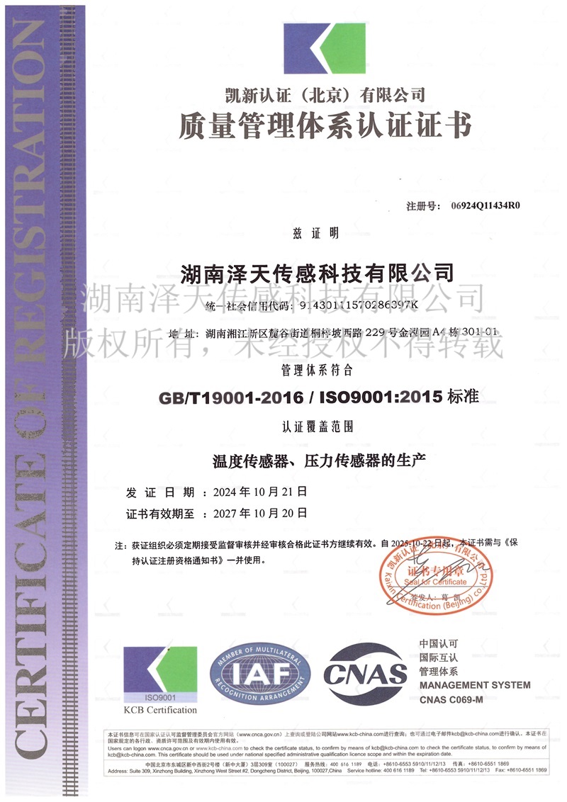 湖南澤天傳感通過ISO9001質(zhì)量管理體系認(rèn)證